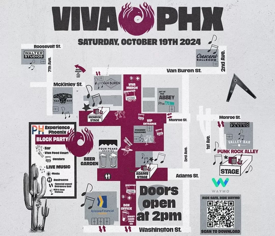 VIVA PHX 2024 takes place on Saturday at multiple locations in downtown Phoenix. Here’s where stages are located at the festival: