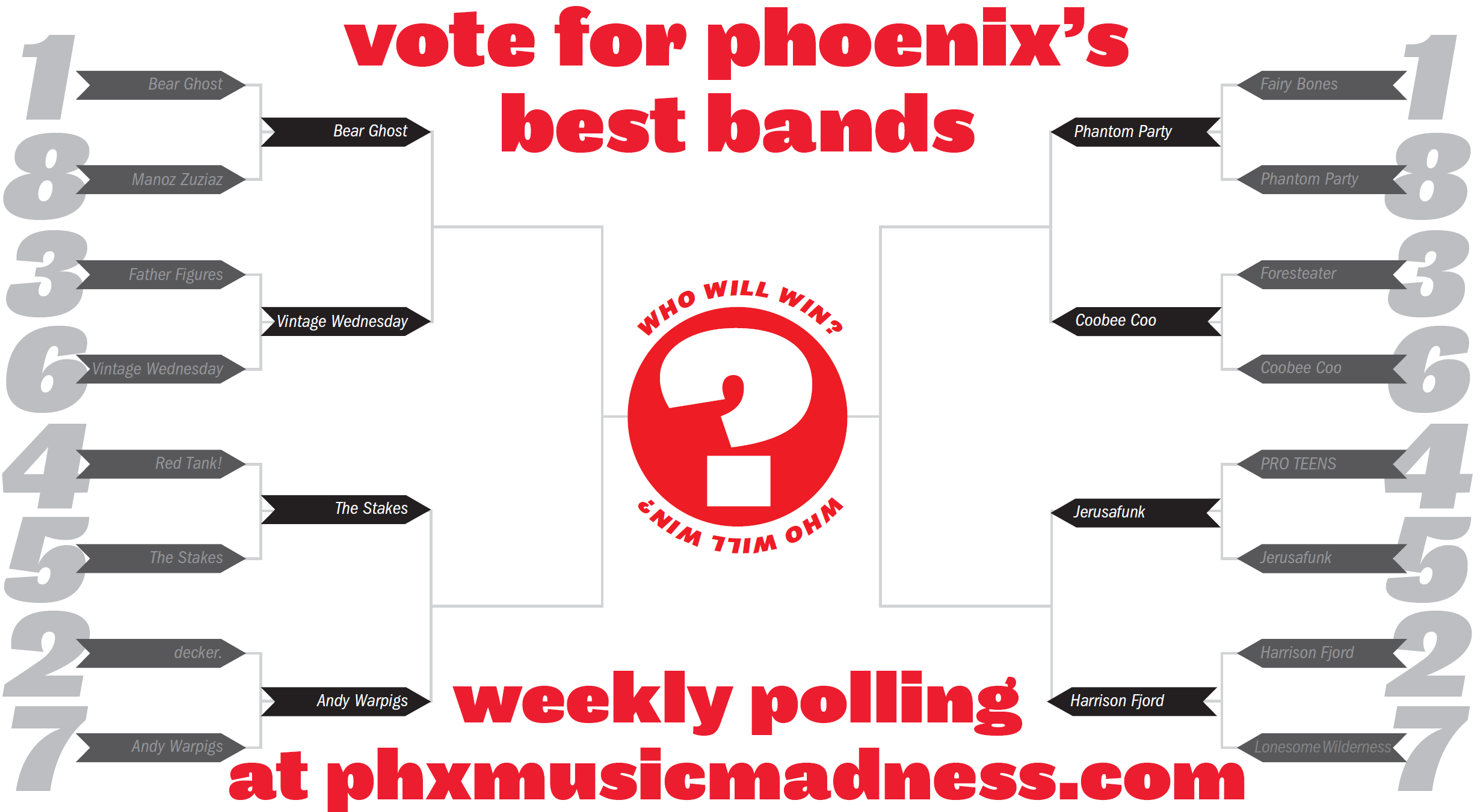 That brings us up to date on the bracket. We will now proceed with a final round of voting, which will determine who plays the free Phinal Phour concert at Rebel Lounge on Wednesday, March 29. Voting ends on Tuesday, March 21, at noon.