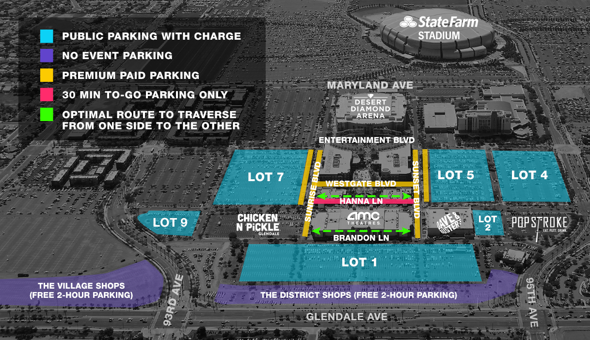 On event days at State Farm Stadium and Desert Diamond Arena, paid parking is implemented four hours before an event through two hours after the event begins. Parking rates vary depending on the event, and all parking is cashless.