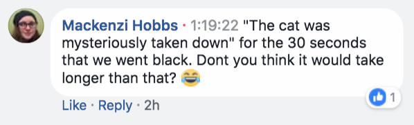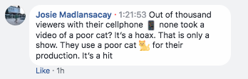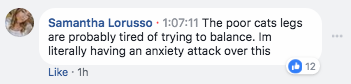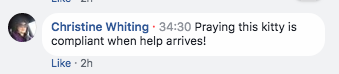 Almost 20,000 people commented on the livestream, and the animal-lovers who tuned in immediately expressed concern for the cat’s life and limb. “[I’m] literally having an anxiety attack over this,” viewer Samantha Lorusso wrote on Facebook.