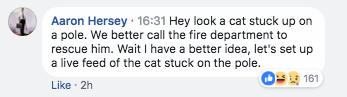 Other commenters gave some supremely unhelpful suggestions for getting the cat down. Although they were occasionally mean-spirited (“Throw rocks at him,” someone suggested) at other times they demonstrated flashes of sheer genius.