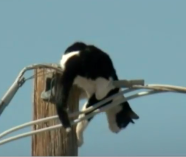 A black-and-white cat gets dangerously close to jumping off of an electrical pole, where it had been stuck since Friday.