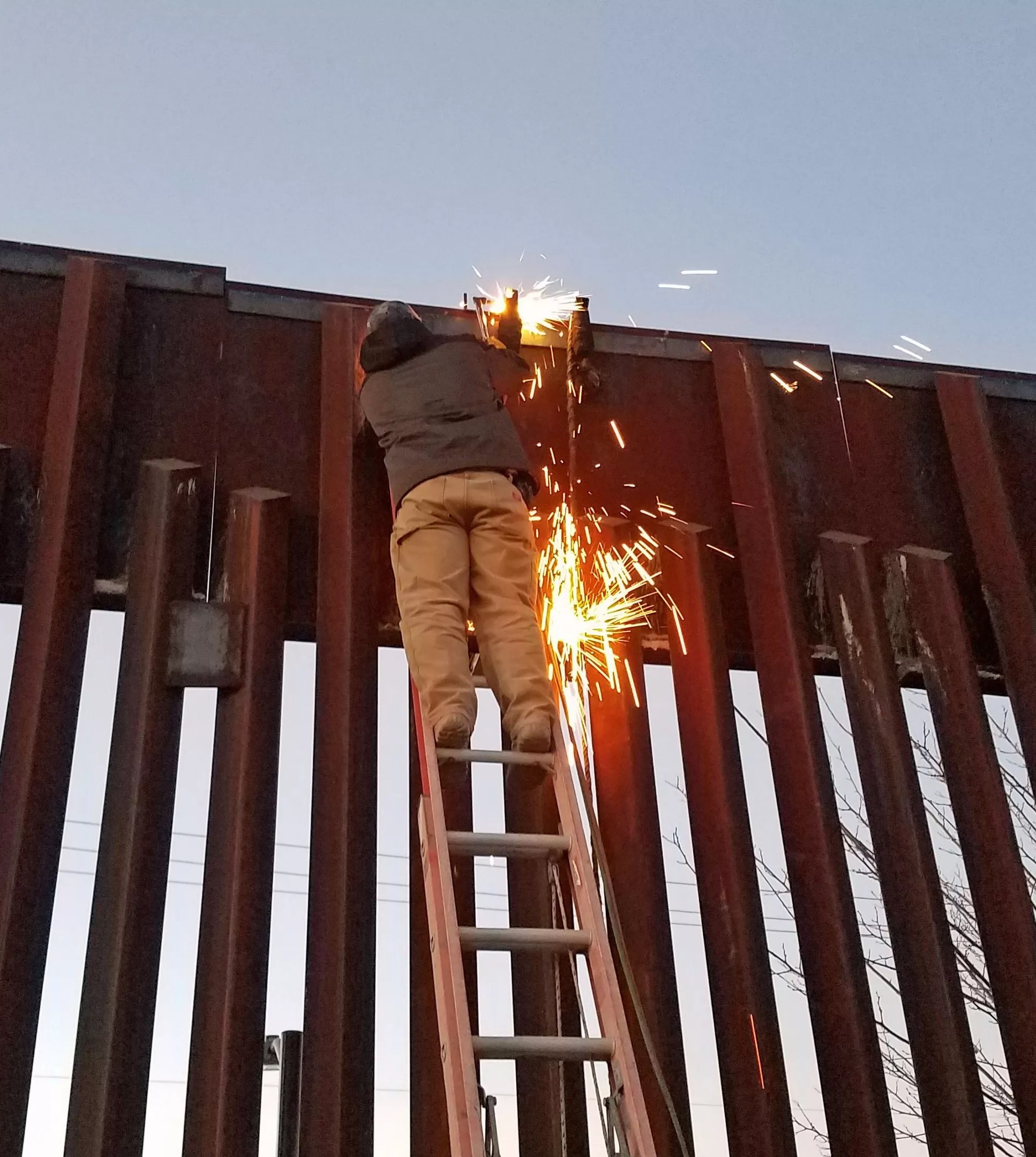 A worker cuts down a catapult attached to a border fence near Douglas.