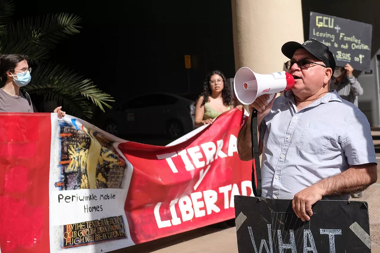 The protesters outside the hotel called Gallego’s record on these issues into question. “The mayor sided with greedy landlords instead of the people. So who does she represent? That’s why the people are out here protesting,” said Sylvia Herrera. A longtime community organizer, Herrera has worked closely with mobile home park residents to fight the evictions over the last year.