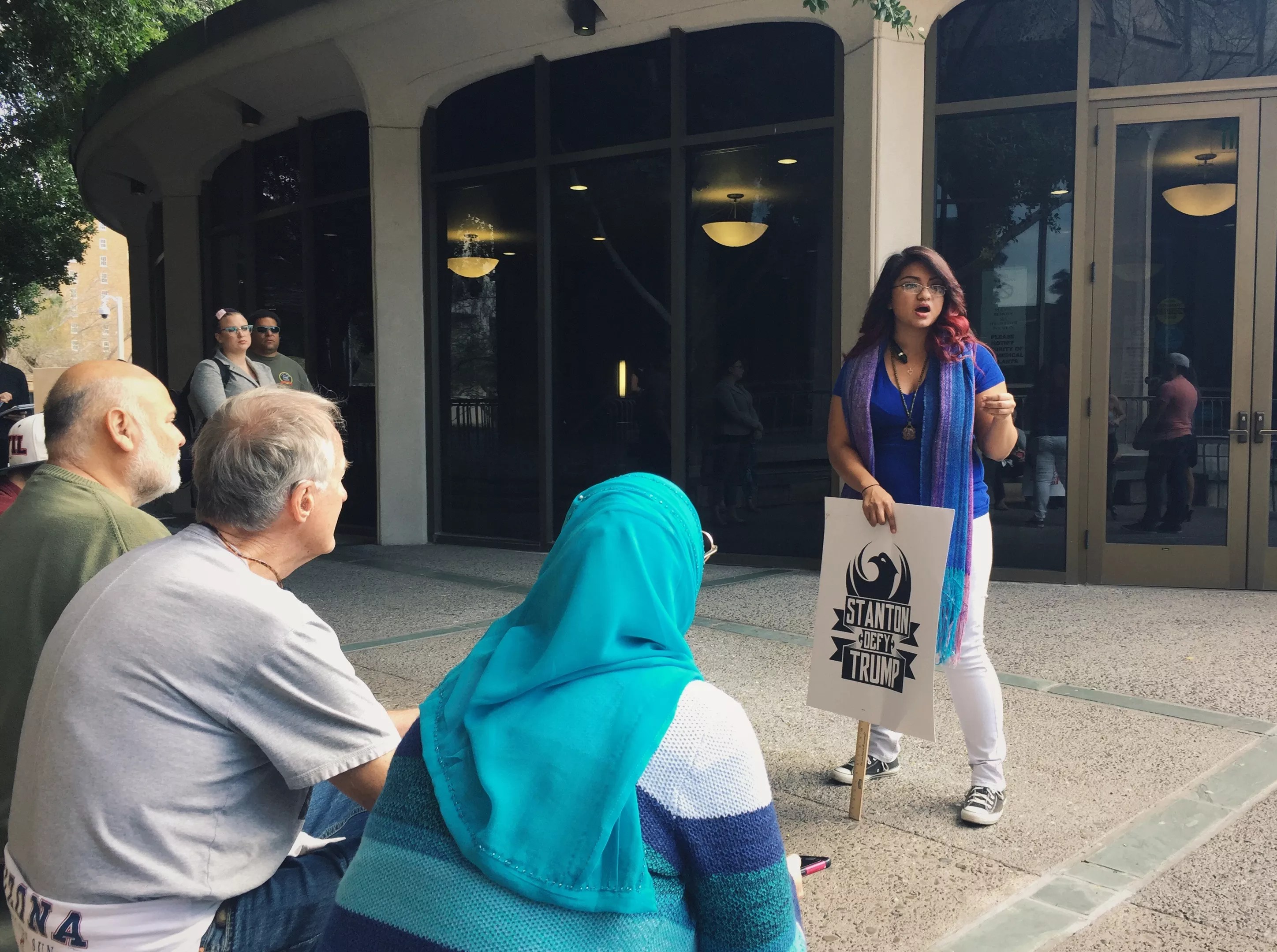 Maria Castro held a sign that said, “Stanton: Stand Up To Trump,” as she stood outside Phoenix City Council chambers Tuesday afternoon.