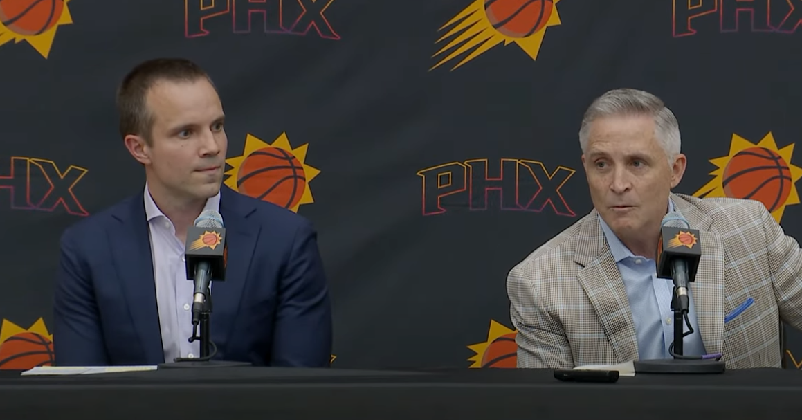 New Suns head coach Jordan Ott at his introductory press conference alongside general manager Brian Gregory.