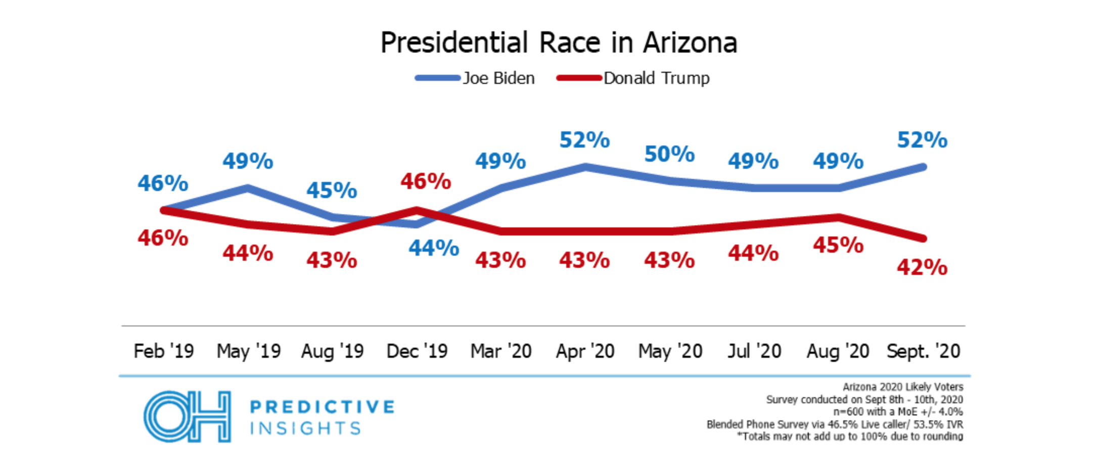 The poll joins other surveys conducted after the Republican National Convention in late August that show Biden firmly leading in Arizona, albeit by different margins. A YouGov poll taken between September 9 and 11 put Biden ahead by three points, and a Gravis Marketing poll conducted during a similar time frame had Biden two points ahead. Meanwhile, a Fox News poll conducted between August 29 and September 1 has Biden ahead by around 9 points. The polling-oriented news outlet FiveThirtyEight gives Biden a five-point lead in Arizona in its regularly updated polling average.