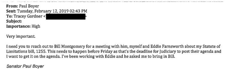 “I need you to reach out to Bill Montgomery for a meeting with him, myself and Eddie Farnsworth about my Statute of Limitations bill, 1255,” Boyer wrote his executive assistant, Tracey Gardner, in an email on Tuesday, February 12. “This needs to happen before Friday [February 15] as that’s the deadline for Judiciary to post their agenda and I want to get it on the agenda. I’ve been working with Eddie and he asked me to bring in Bill.”