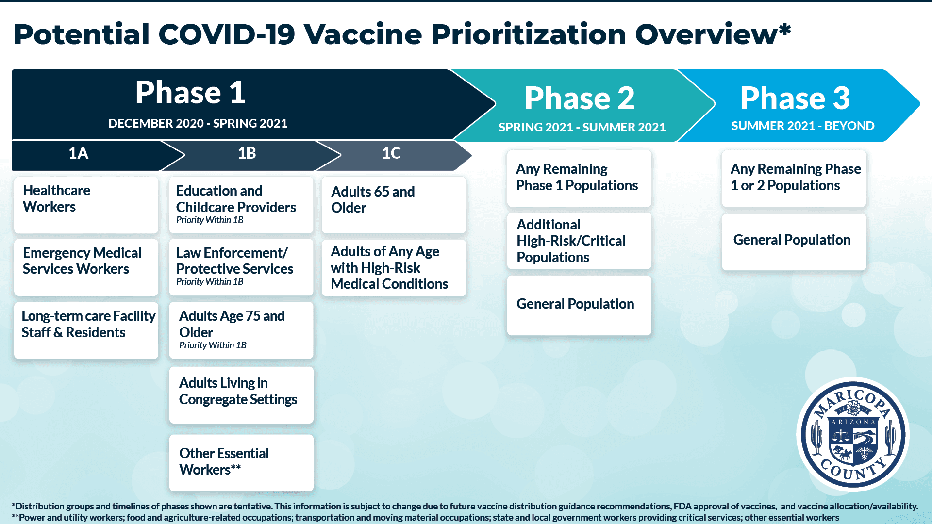 Maricopa County is currently in the prioritized phase of 1B. The chart doesn’t reflect that the fact that the county is currently prioritizing only K-12 educators and childcare providers. The state is following similar guidelines but including people 65 and older.