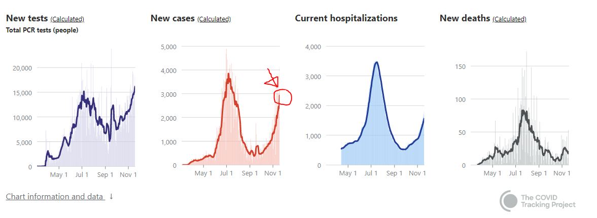 The state is averaging over 3,100 new cases of COVID-19 each day. That’s an increase of 1,100 more cases each day from just a week ago. The last time daily cases were this high and rising was July 1, five days before the summer peak.