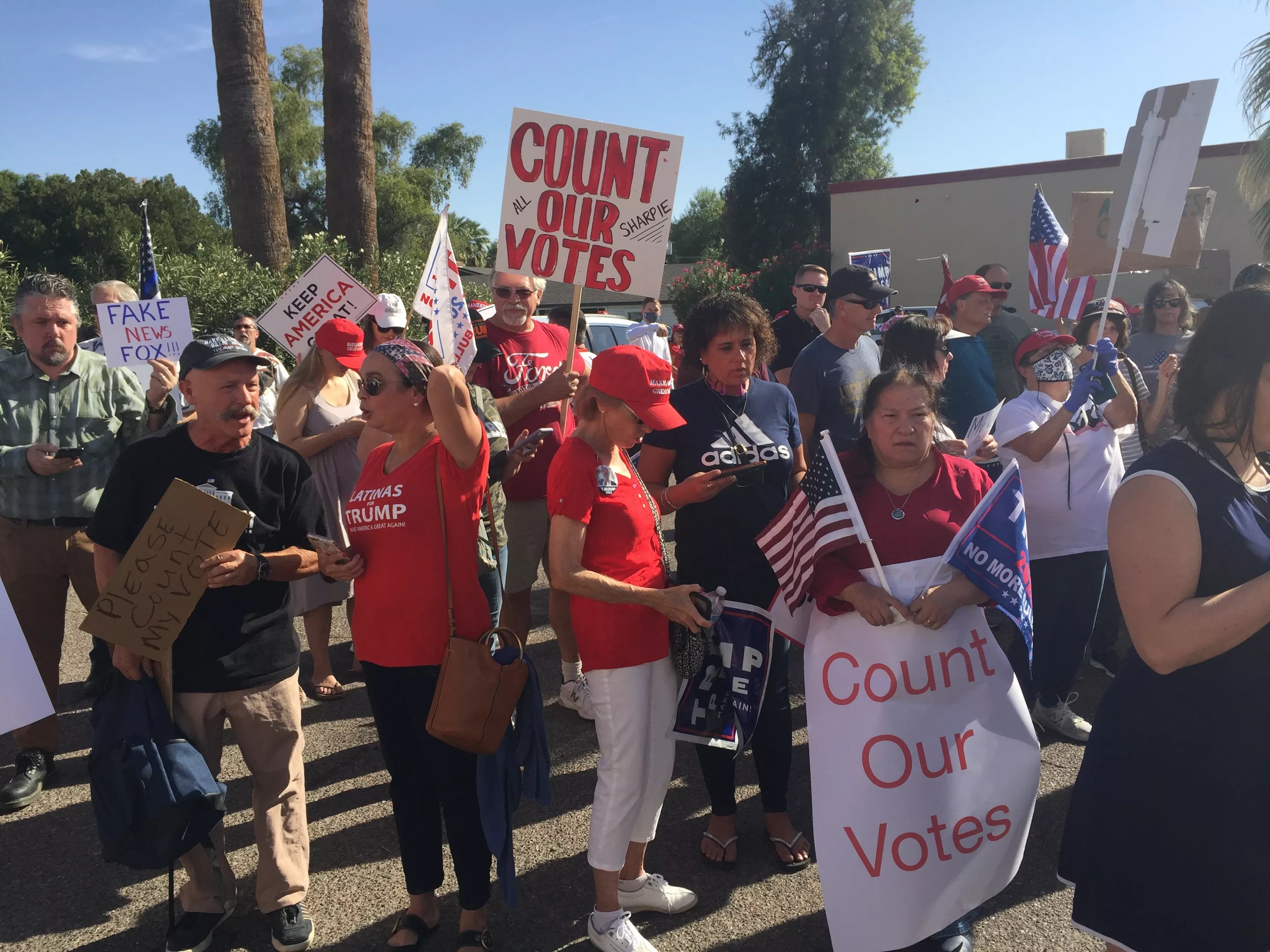 11/5, 3 p.m., Phoenix. Standing before a raucous crowd of Donald Trump supporters outside of Arizona Republican Party headquarters in east Phoenix, a slew of local Republican leaders asserted in a show of force that the president is going to win Arizona in the end and claimed, without evidence, that the election could be “stolen” from Republicans.