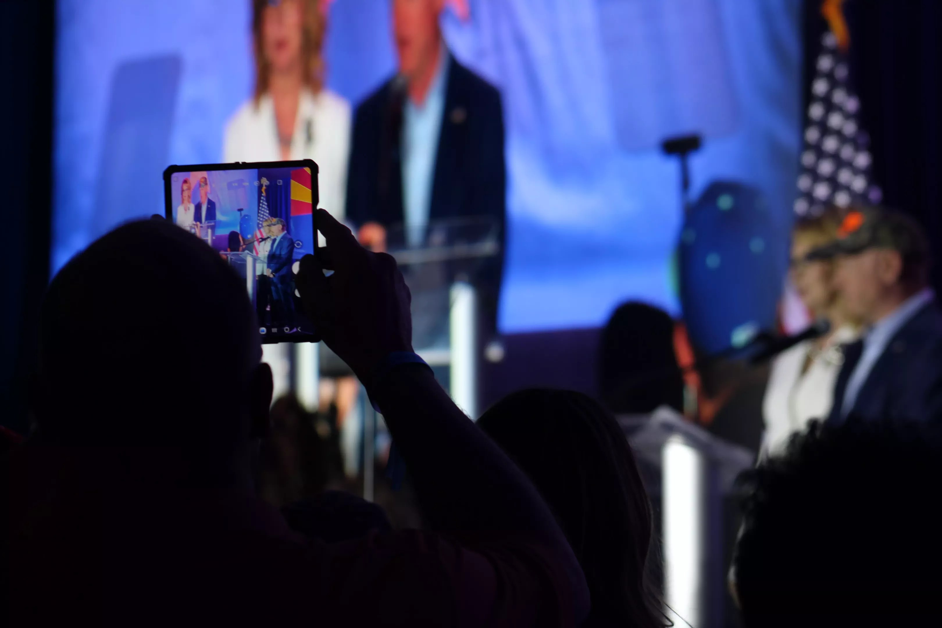 Enthusiasm was high for a Democratic Party success story in Arizona’s open Senate seat Tuesday night. While preliminary results remain tight, cheers were loud as U.S. Senate candidate and current Rep. Ruben Gallego took the stage with his wife Sydney Gallego at the party’s Election Night event.