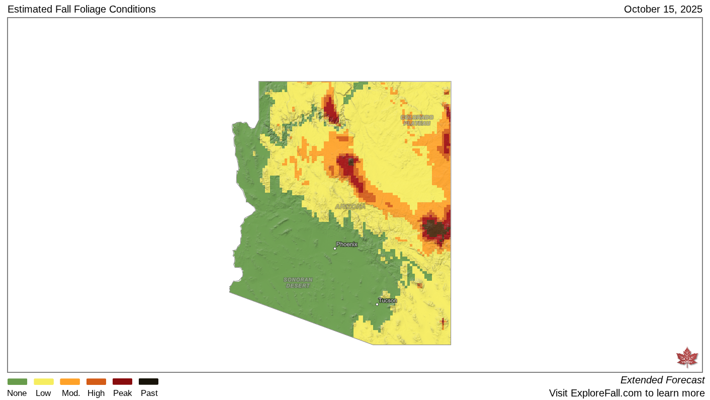 But by Oct. 15, much of the state will start to see colors changing moderately, with a few pockets in the east and areas near the Grand Canyon, Sedona and Flagstaff experiencing “peak” fall colors.