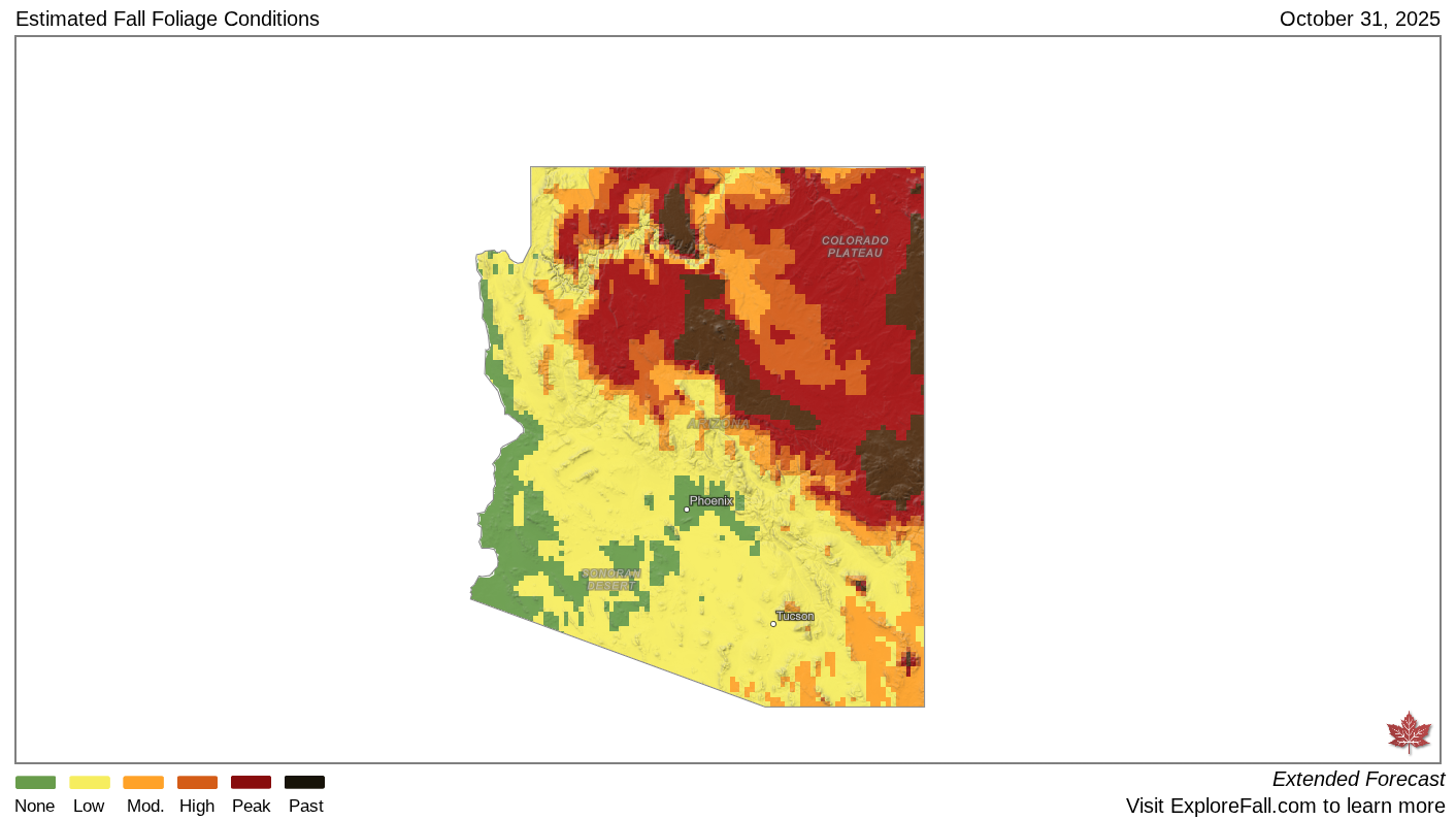 By about Nov. 15, pretty much all of that area will be past peak color – the exception being southeastern parts of the state like Cochise County, where Bisbee is located.