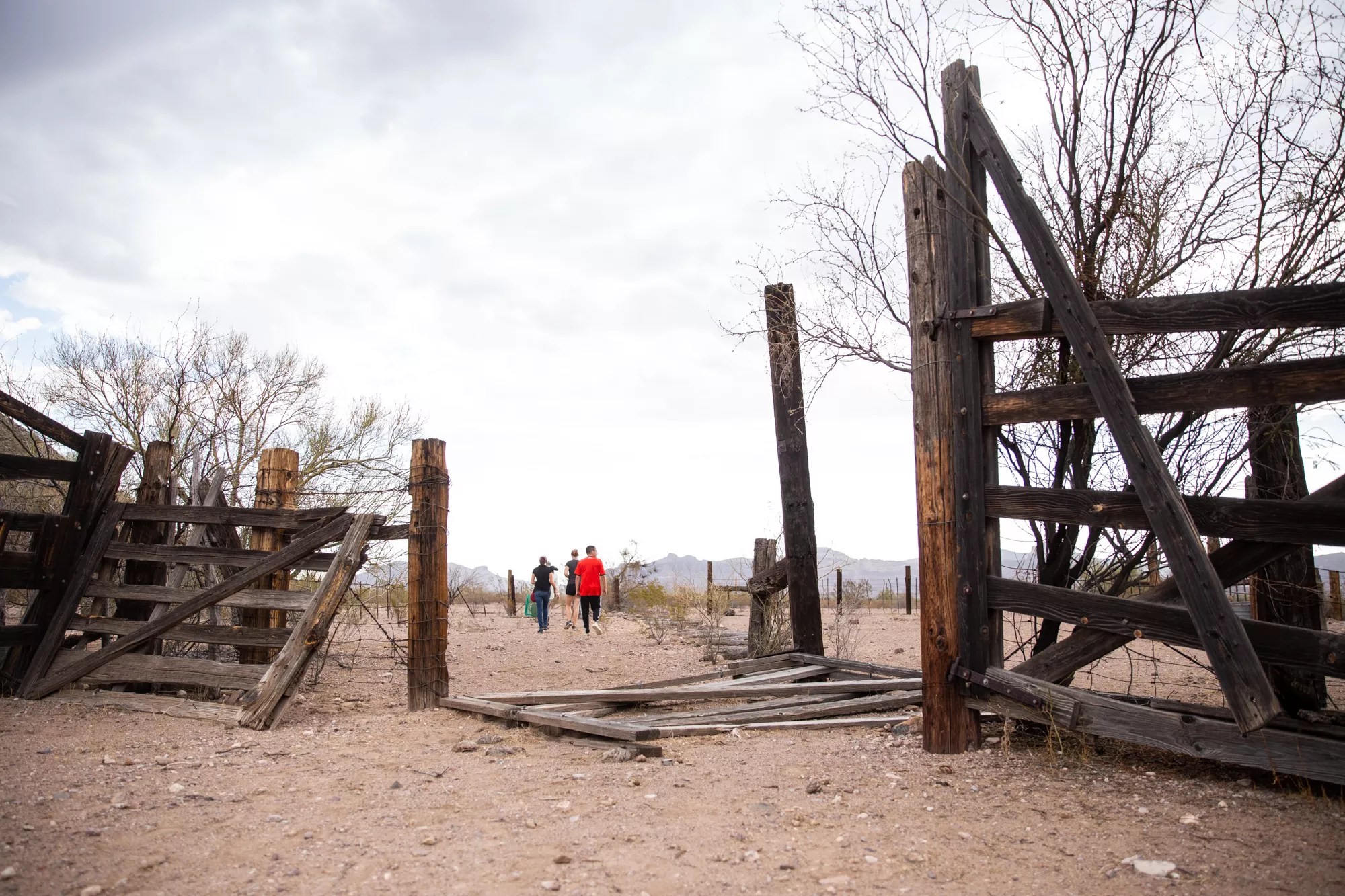 Volunteers for No More Deaths walk through an abandoned corral, one of many sites where the organization leaves food and water for migrants crossing the desert in southern Arizona.