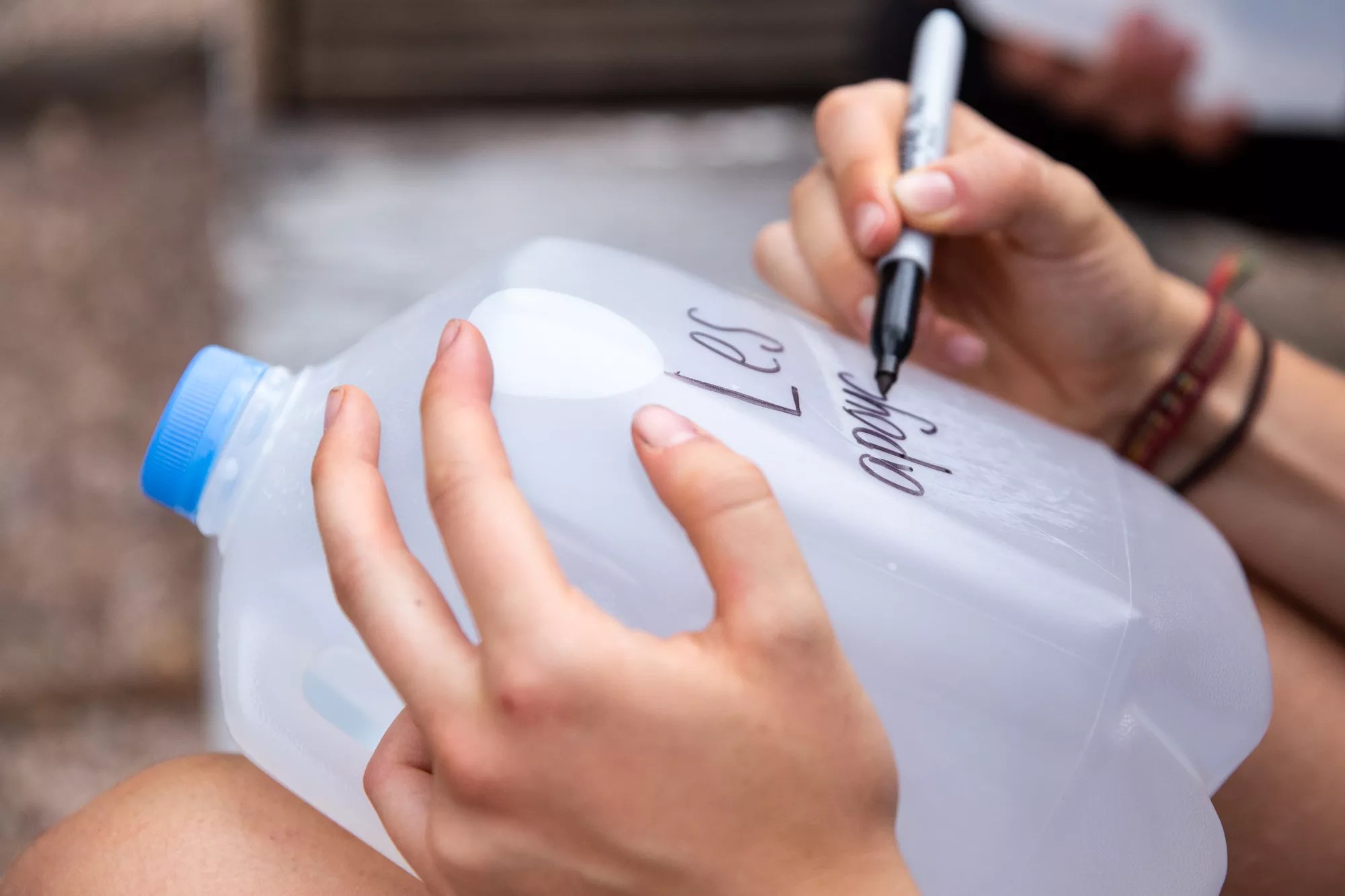 Vanessa Savel writes “We support you” in Spanish on a gallon of water left for migrants. Other messages that volunteers write in Spanish on water bottles bottles include “Good luck” and “Go with the force of God.”