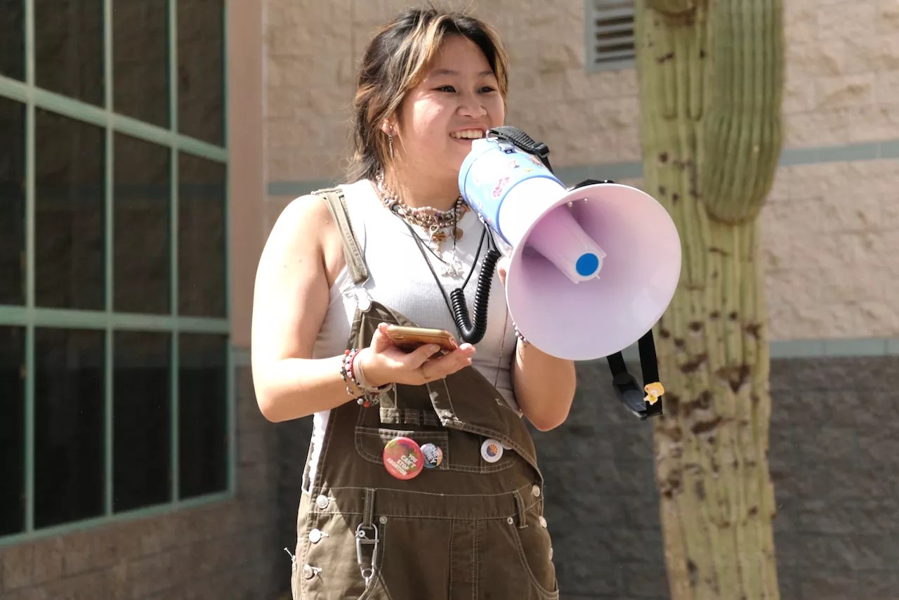 The students – led by 16-year-old Hamilton junior Dawn Shim – were protesting two laws that took effect in Arizona on September 24 that they said target LGBTQ youth. They marched, some with bullhorns, to the Chandler Public Library next door and gathered on the lawn.