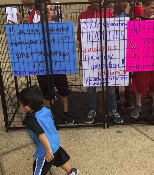 Another photo of the same event shows clearly that the cage and boy were part of a immigration policy protest.