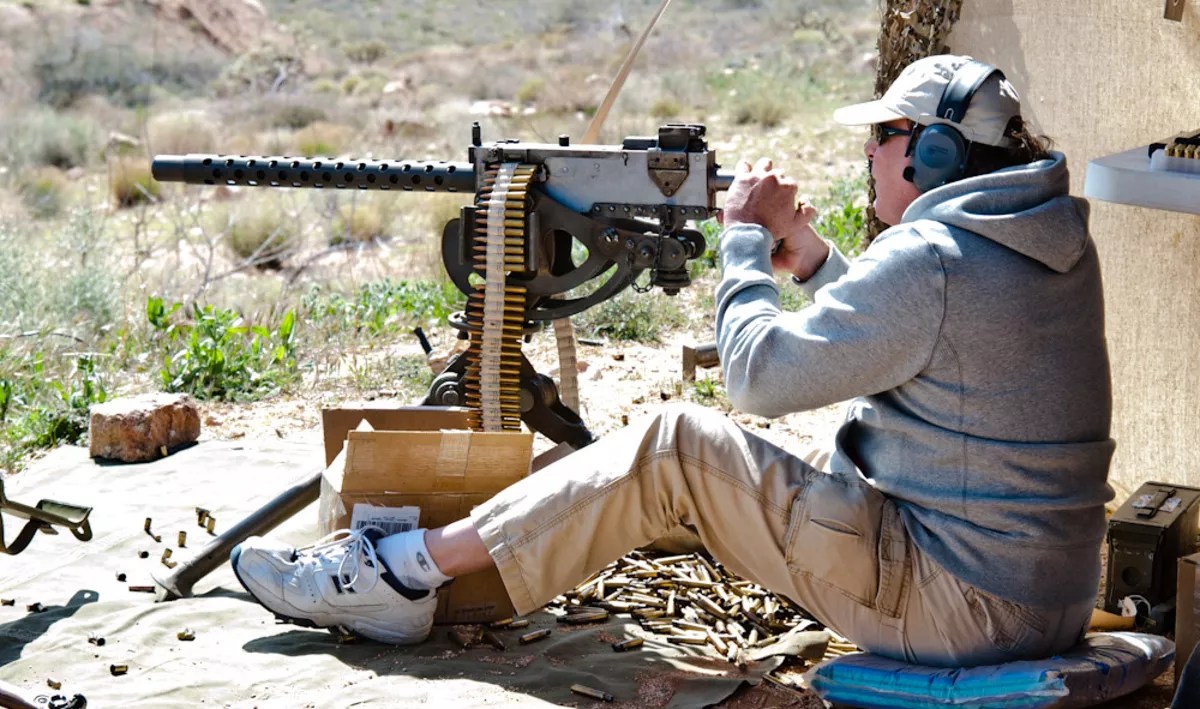 A man shoots an M1919 .30 belt-fed machine gun at an Arizona gun range.