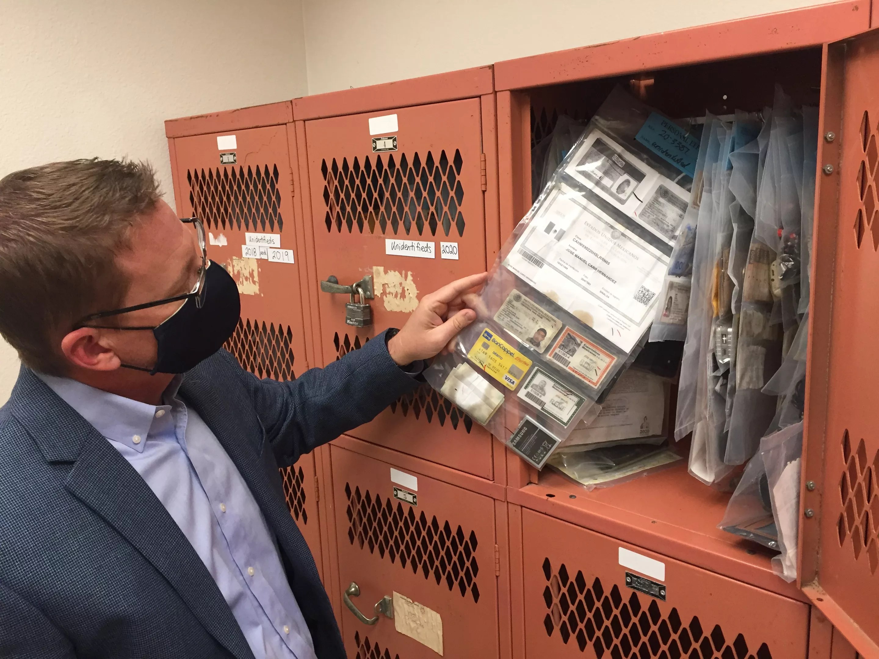 Dr. Greg Hess shows property items found among migrant remains recovered in southern Arizona.