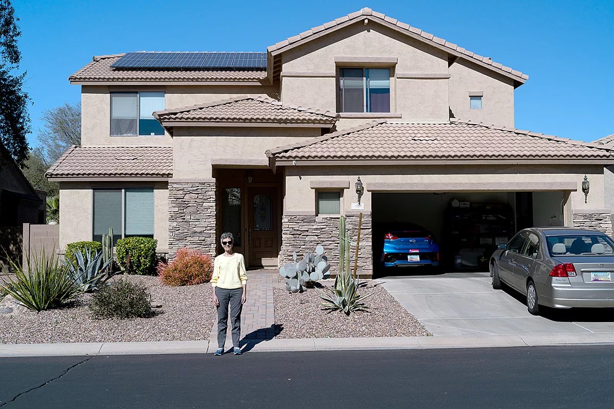 “It wasn’t the greatest investment,” she admitted. Arizonans for Community Choice Director Shelley Gordon at her solar-panel-equipped Mesa home: “There’s all this solar in Arizona and we’re not using it.” James Deak