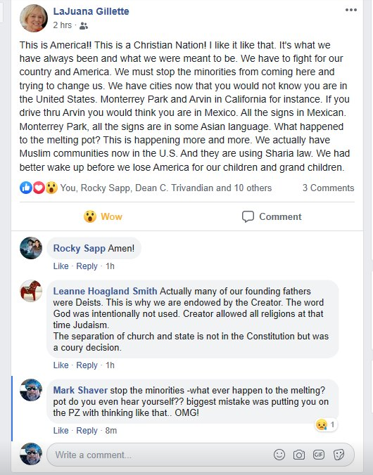 “We have cities now that you would not know you are in the United States,” she wrote. “Monterrey [sic] Park and Arvin in California for instance. If you drive thru [sic] Arvin you would think you are in Mexico. All the signs in Mexican. Monterrey Park, all the signs are in some Asian language. What happened to the melting pot? This is happening more and more. We actually have Muslim communities now in the U.S. And they are using Sharia law. We had better wake up before we lose America for our children and grand children.””