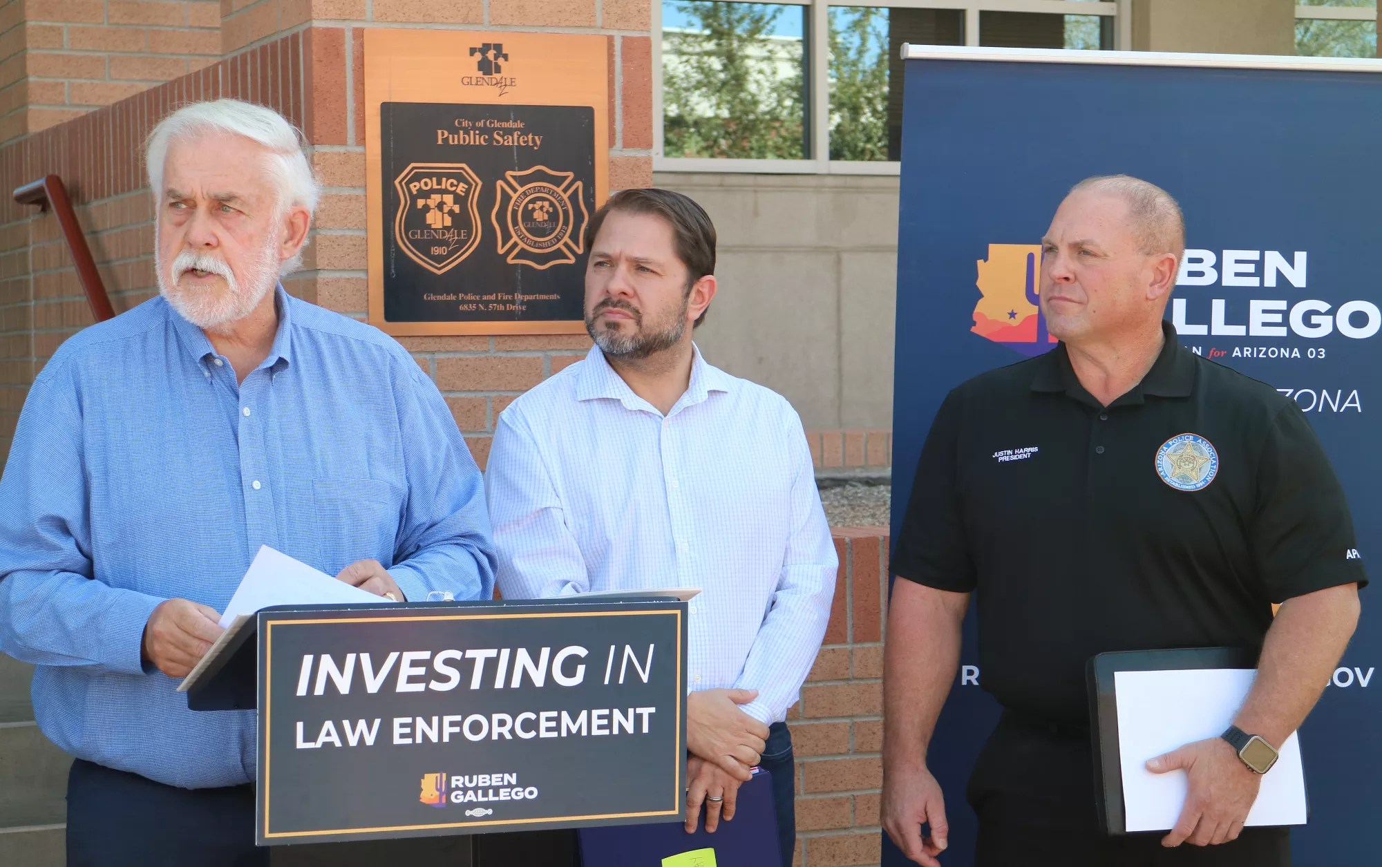 Glendale Mayor Jerry Weiers speaks at a press conference held by Democratic Rep. Ruben Gallego (center). Glendale police Sgt. Justin Harris stands to the right.
