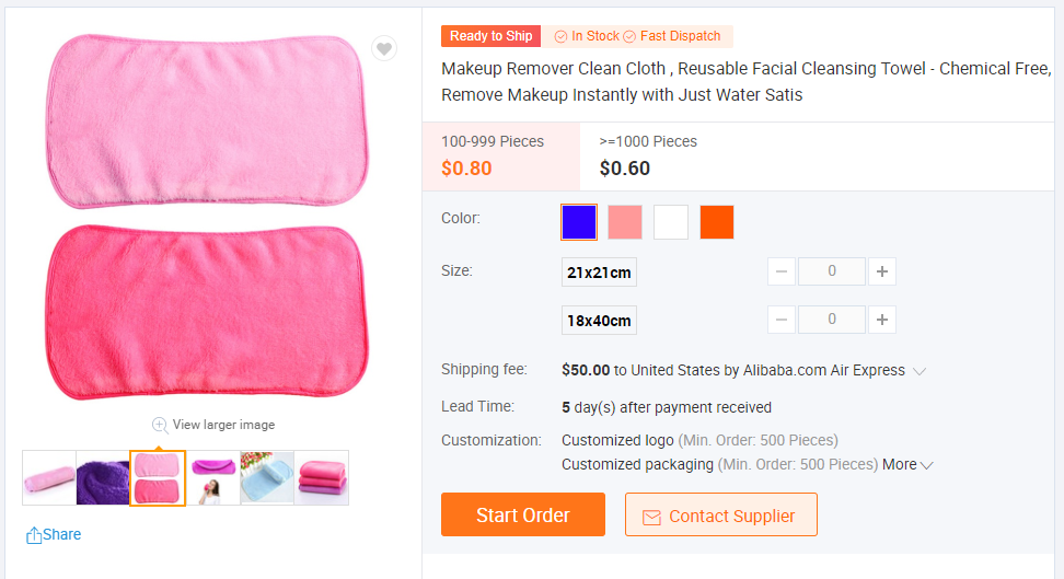 Hebei Laibang sells its cloth for between $0.19 to $1.99 with a minimum order of 500. Here’s what that product looks like on Alibaba: