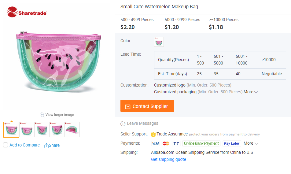 Among the products sold by Xiamen Sharetrade is a watermelon-themed makeup bag that it sells for $2.20 each for buyers purchasing between 500 to 4,999 pieces. Here’s what the watermelon bag looks like on Alibaba: