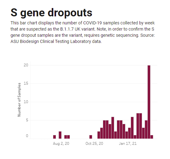 A growing percentage of the positive tests processed by Arizona State University are potential cases of the more infectious U.K. variant. While the overall number of suspected variants cases is low – last week saw the most with just 20 – there have been days when suspected U.K. variant cases comprised nearly one in five positive tests at ASU. The cases require further testing to confirm that they are the U.K. variant.