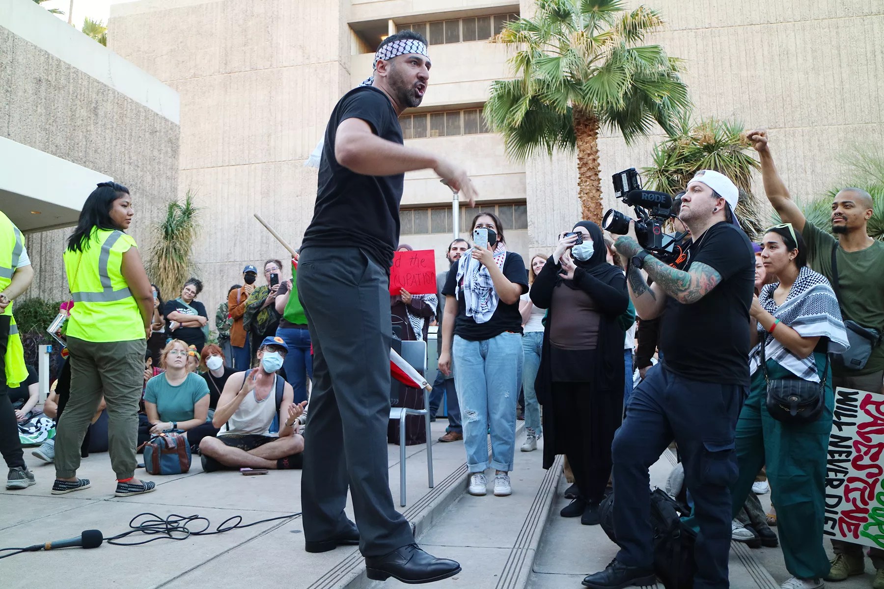 Instead, the crowd of about 50 who had gathered for the presentation huddled around a laptop outside the locked doors of Neeb Hall, with Tlaib and state Rep. Athena Salman, a Tempe Democrat, delivering remarks virtually. Event organizers used a megaphone to amplify the laptop’s speakers so the attendees could hear.
