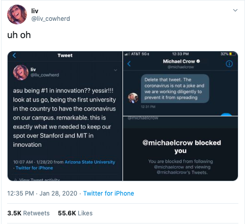 The tweet quickly took off and was shared and liked nearly 60,000 times. But some mistook Cowherd’s fictional conversation with Crow for the real thing and tweeted at Crow, demanding he unblock her. The tweets, Cowherd clarified to her followers, were Photoshopped with the help of Rudy Mustang, who is known for creating fake tweets. “Michael Crow would never actually block a student!!” Cowherd wrote on Twitter on January 29.