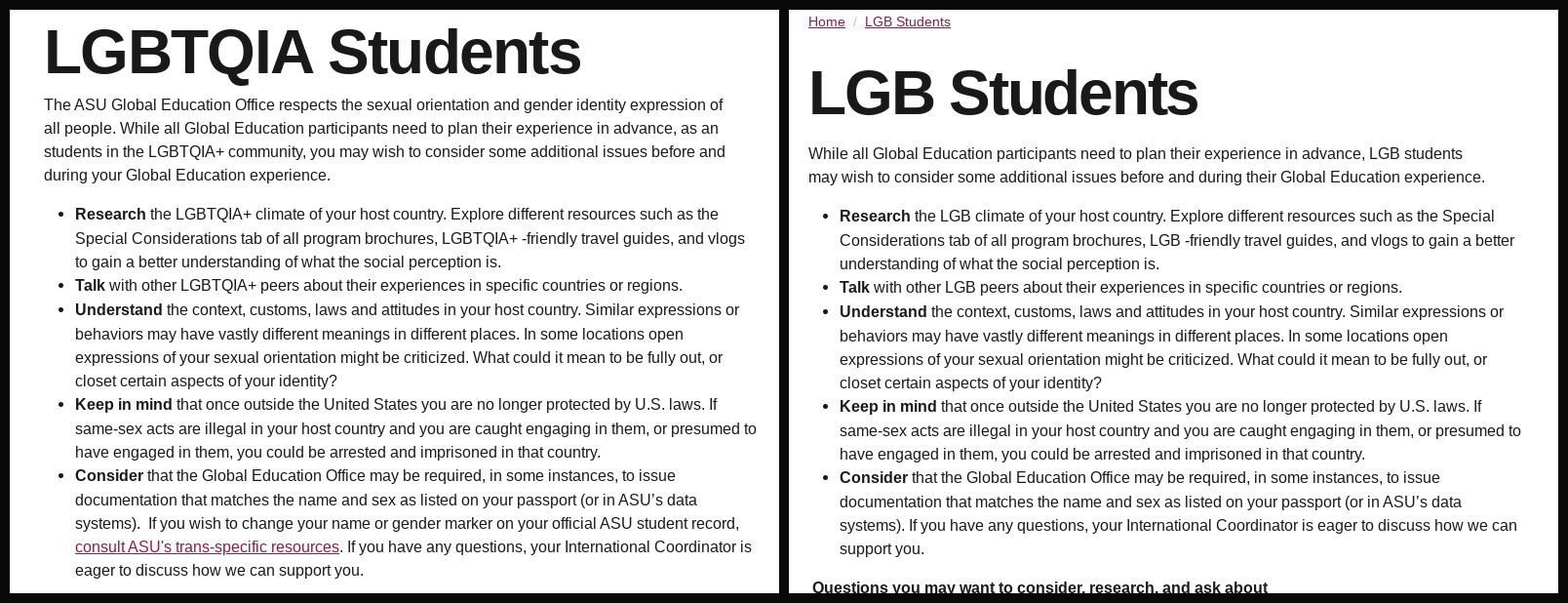 The Global Education Office’s online guide for queer students before (left) and after (right) scrubbing mentions of trans students.