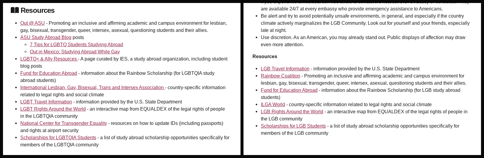 Resources for queer students listed by the Global Education Office before (left) and after (right) the page was scrubbed for mentions of trans people. Every resource originally listed was altered or deleted. The original set of resources has not returned.