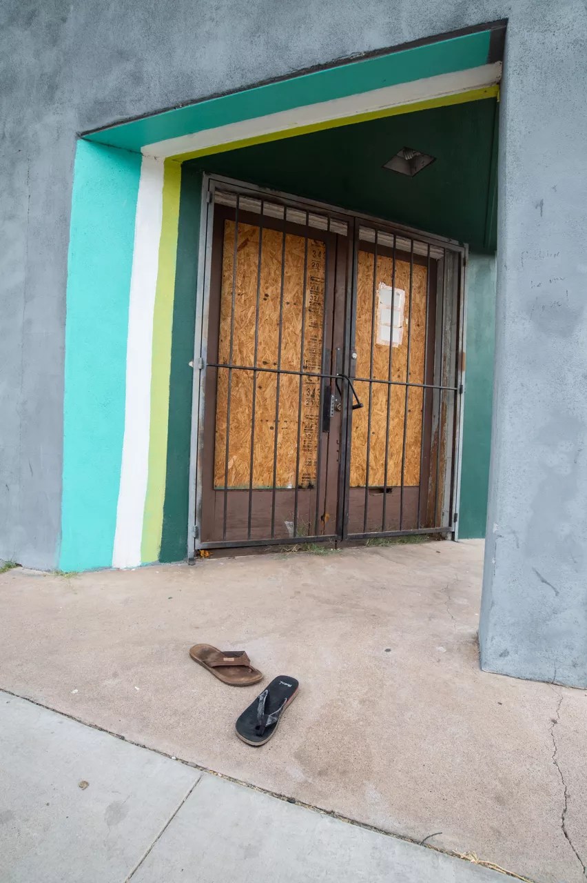 Sandals were left in the doorway of a shuttered building. Fifteen property owners in the Zone filed suit in August 2022, claiming that the encampment has “irreparably harmed” their businesses and homes.