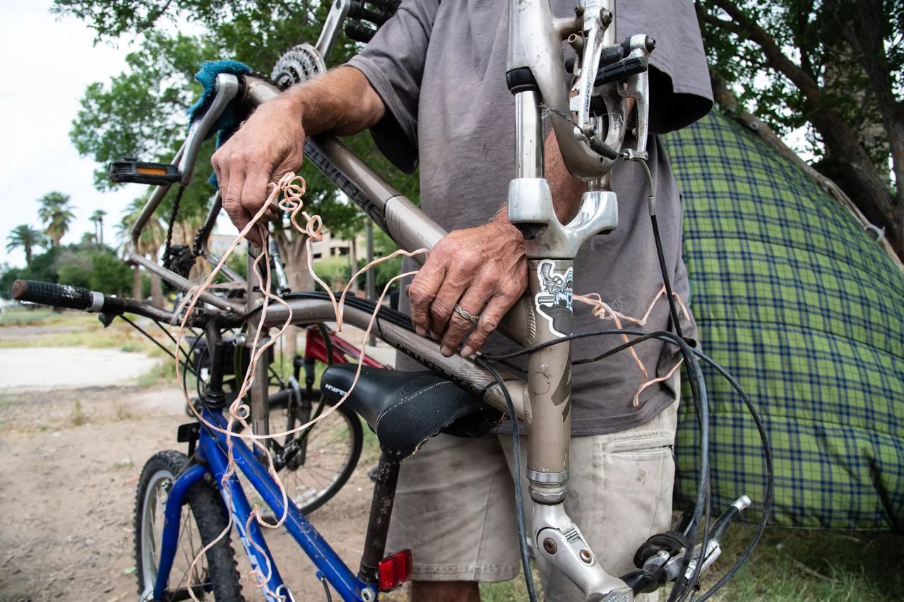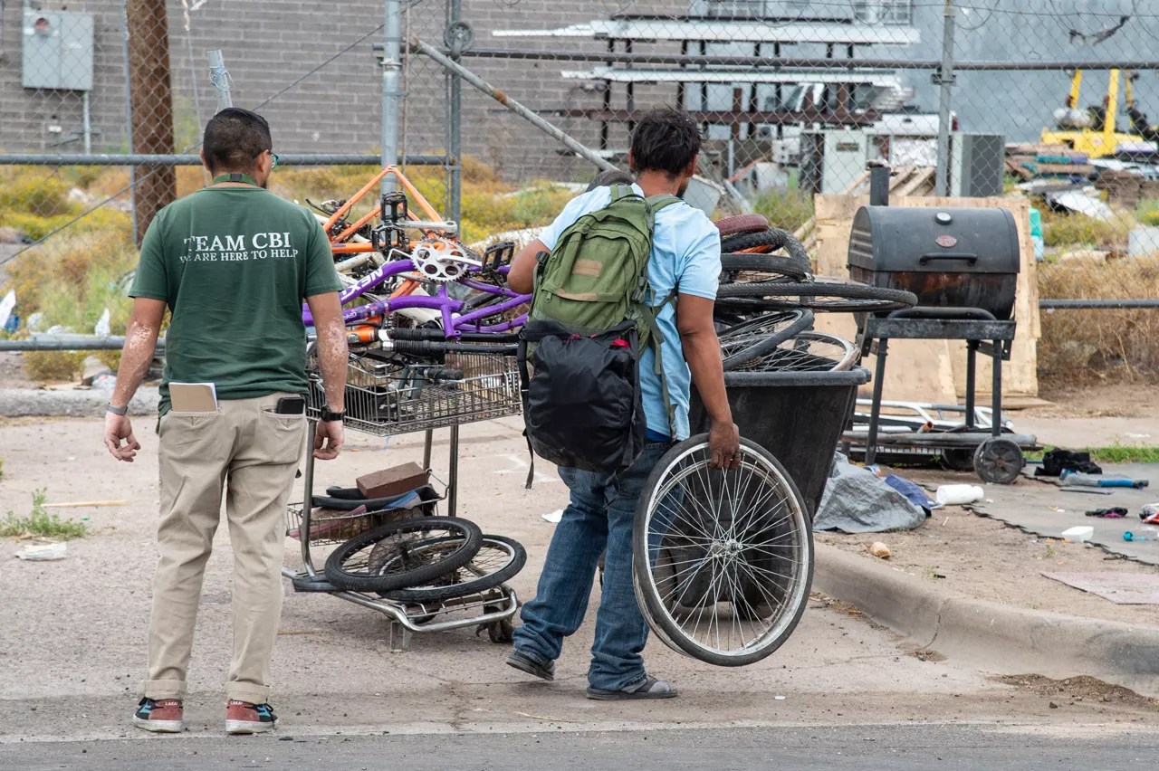 One Zone resident packs his collection of bike frames and tires into a three-wheeled cart while a worker from Community Bridges, a behavioral health treatment facility, looks on.