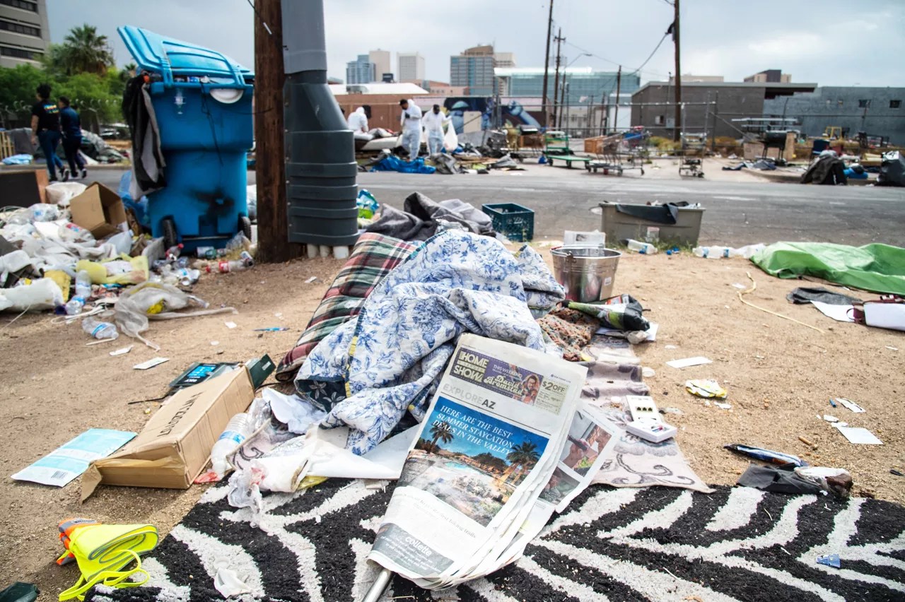 A copy of a recent Arizona Republic sits on a pile of trash while hazmat-clad city officials remove a Zone structure. The newspaper was open to an article titled “Here are the Best Summer Staycation Deals in the Valley.” It is a haunting juxtaposition between the city’s haves and have-nots.