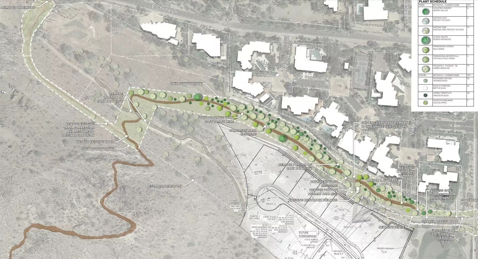 Besides the bathroom and water fountain, the relocation design has hikers entering through what is now a construction road just south of East Vista Drive and walking through a newly constructed trail at one end of The Phoenician’s golf course before connecting with the main Cholla Trail. The rendering shows how the new trail section would have trees for cover, but ideas that are still being discussed include a possible wall separating the hiking rabble from the multi-million-dollar homes they would be near, or a below-grade “cattle chute” that would hide the hikers. Those are apparently secondary considerations. The draft layout of the new trail opening as depicted in the rendering is complete, Bach said, and the final design issue relates to water drainage.