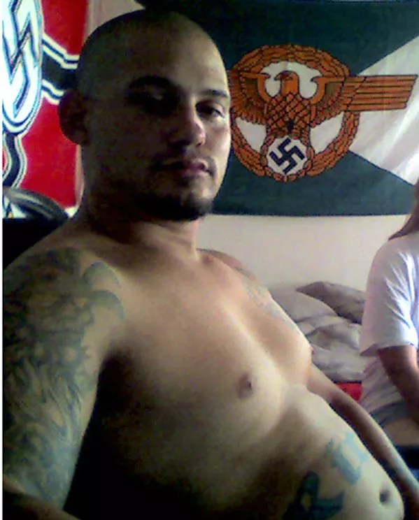 His tattoos speak volumes. On one side of his neck is a swastika, on the other, SS lightning bolts. Thick Gothic script on his forearms proclaims, “Meine Ehre Heisst Treue” (My Honor is Loyalty), the motto of Hitler’s dreaded Schutzstaffel, the black-clad vanguard of the Holocaust.