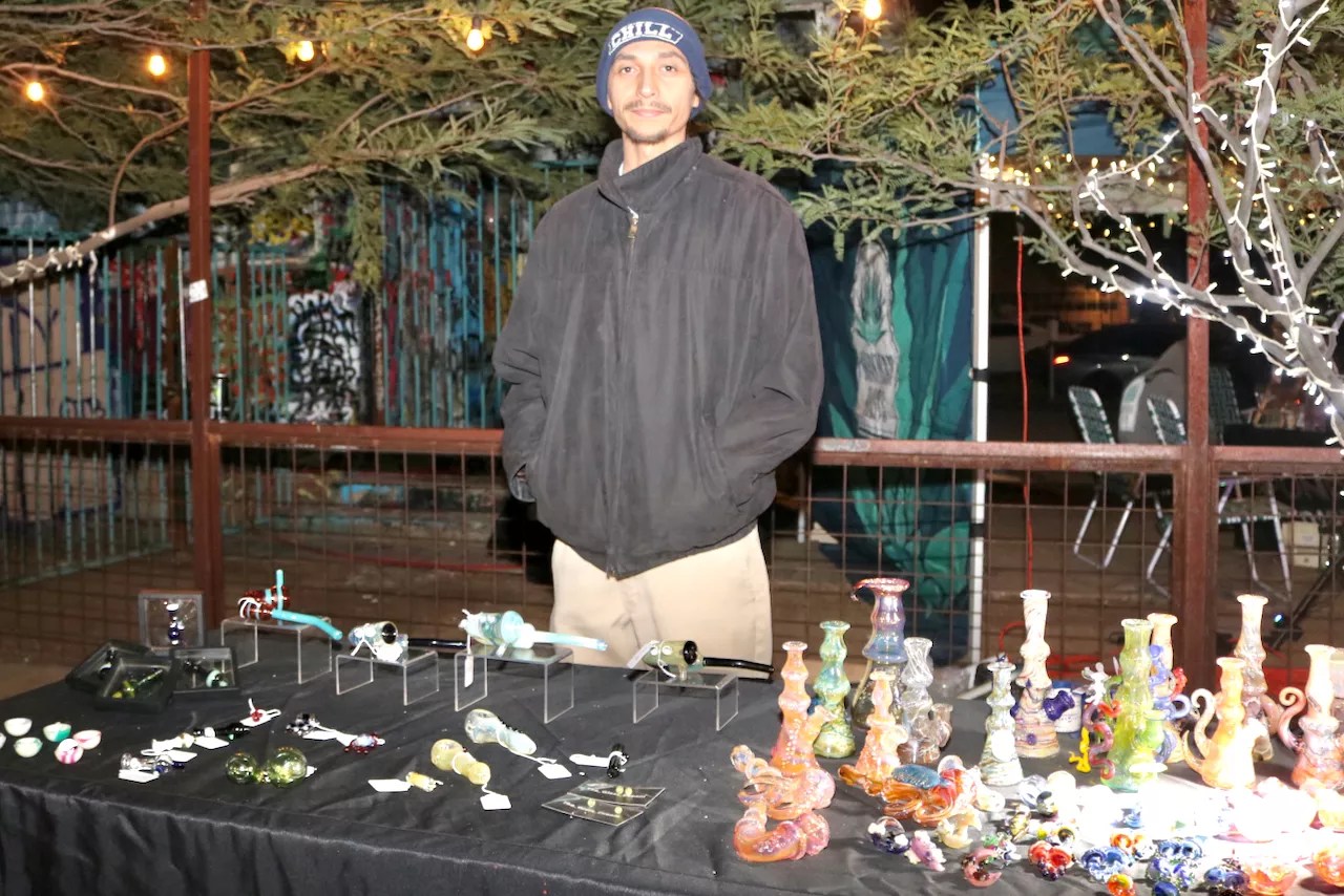 In front of the graffiti-painted house that is home to Bud’s, Mario was repping Sonoran Roots in Tempe and the Ponderosa Dispensary in Peoria. “[The event’s] not a market with your typical plastic bongs anymore,” he said. “It’s gotten more intricate, and it’s come a long way. One thing I like about certain glass blowers is they use opals, adding more energy to whatever you’re smoking.”