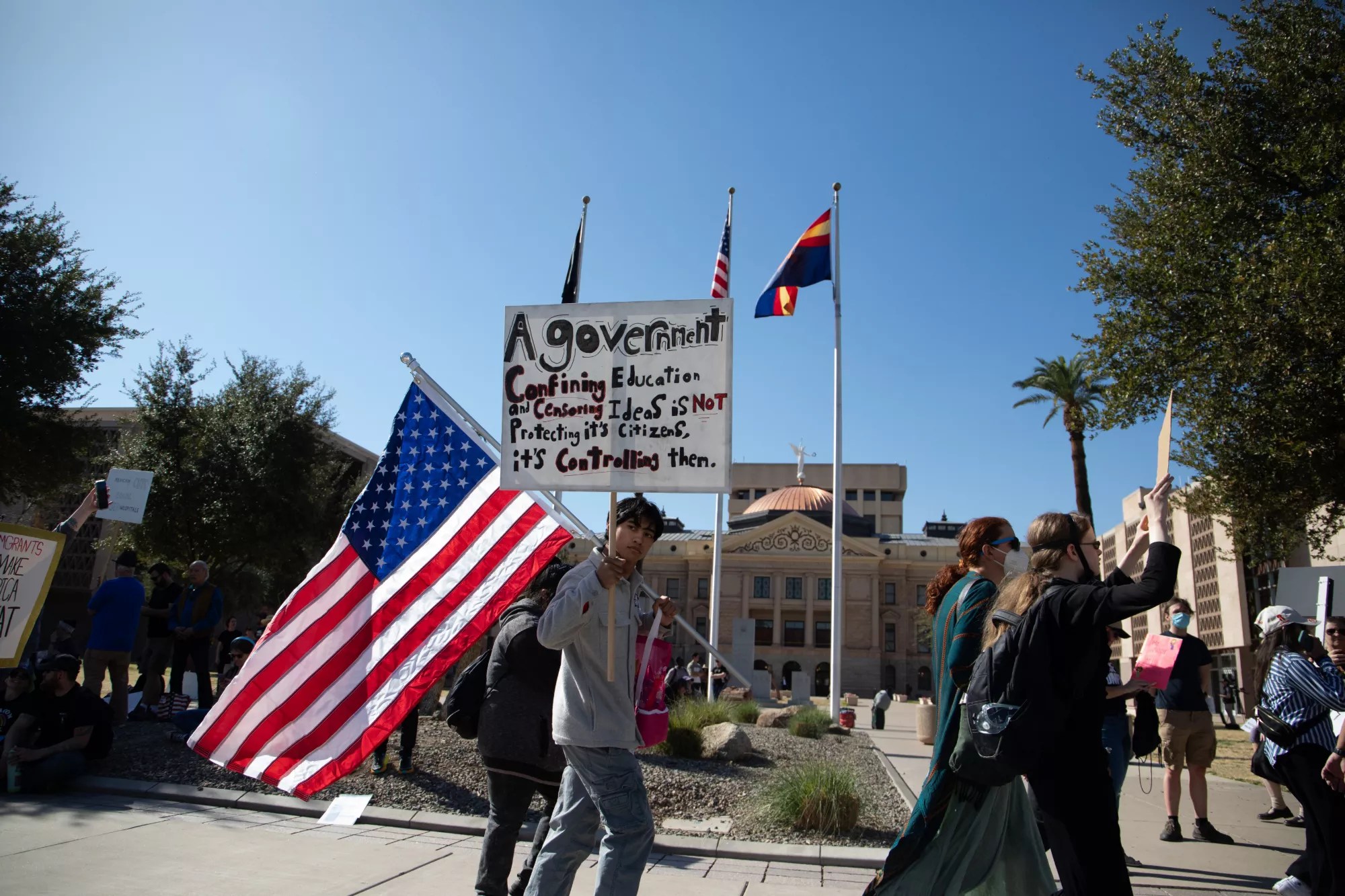 Arizona’s protestors were part of a national day of protests at the state capitols under the banner of 50501, a movement that called for direct action against the Trump administration on Wednesday. Redditors organized the nationwide protest; in Phoenix, the movement was grassroots. Individual organizers and organizations such as the Party for Socialism and Liberation Phoenix brought together protestors from across Phoenix’s Valley and the state – including Tucson, Tempe, Anthem, Payson and Sun City.