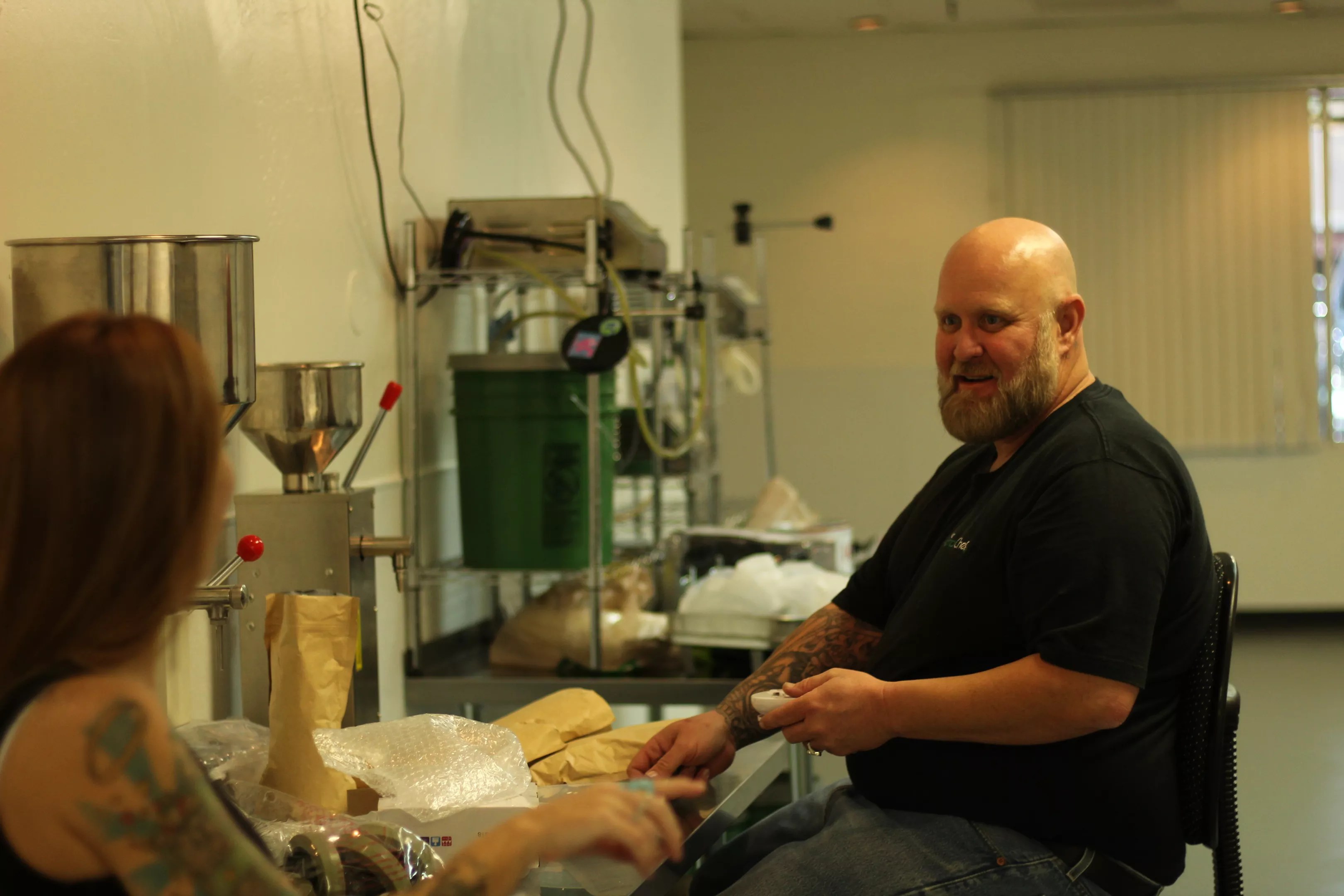 One minute, he’s directing two men there to install a new freezer. Then he’s meeting with one of his business partners, Payton Curry of Flourish edibles, who’s sipping from a mason jar of iced, dark-green, raw-cannabis juice. Later, he and Andi stood in front of a laptop in a small office, going over their latest sales figures.