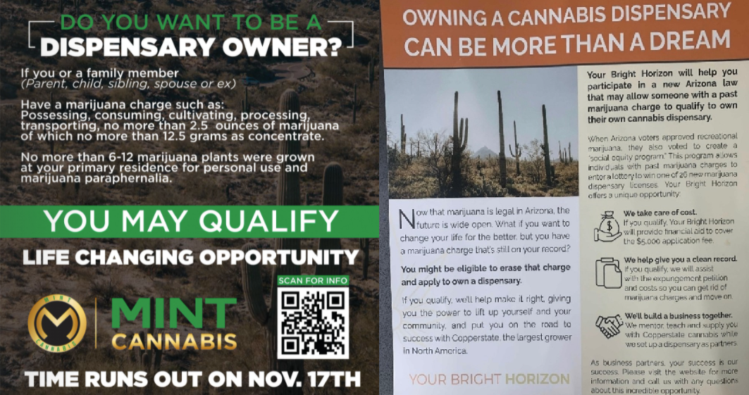 Over the past few weeks, some Arizona residents have been inundated with flyers, mailers, and glossy pamphlets. “Once in a lifetime opportunity,” they say. “Brighten your future. Own a cannabis dispensary at no cost to you.”