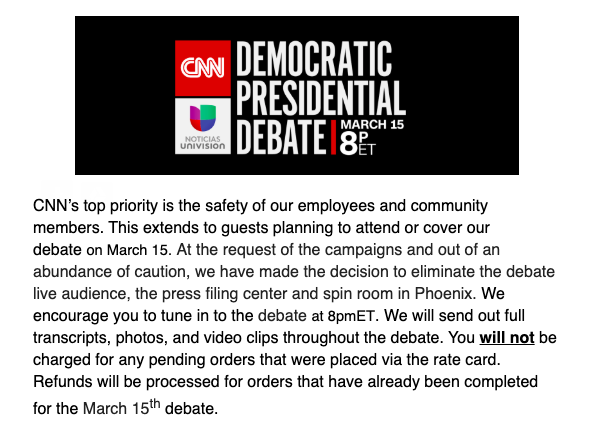 “CNN’s top priority is the safety of our employees and community members,” the network said in an email. “This extends to guests planning to attend or cover our debate on March 15. At the request of the campaigns and out of an abundance of caution, we have made the decision to eliminate the debate live audience, the press filing center and spin room in Phoenix.”