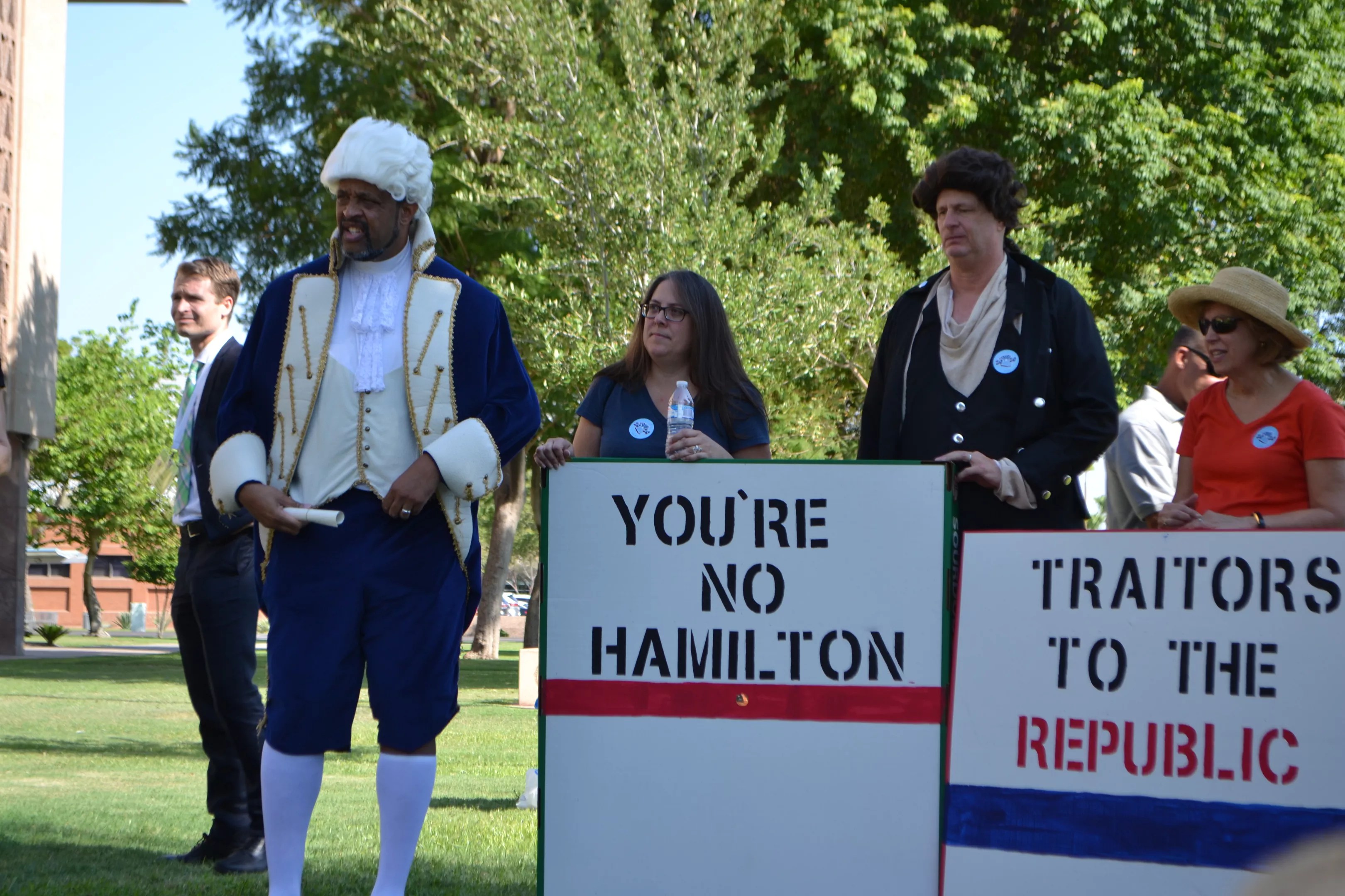 Arizona chapters of Indivisible, some dressed as historical figures, protested on the Arizona Capitol lawn asking legislators to keep their hands off the Constitution.