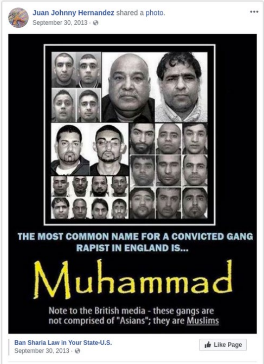 In 2013 and 2014, current Phoenix police sergeant Juan Hernandez shared a multitude of offensive memes on his personal Facebook page. “The most common name for a convicted gang rapist in England is Muhammad,” one of the posts read. “These gangs are not comprised of ‘Asians’; they are Muslims.” Another post – titled “Recent Contributions to Science By Islam” – mocked Islam and Muslim people.