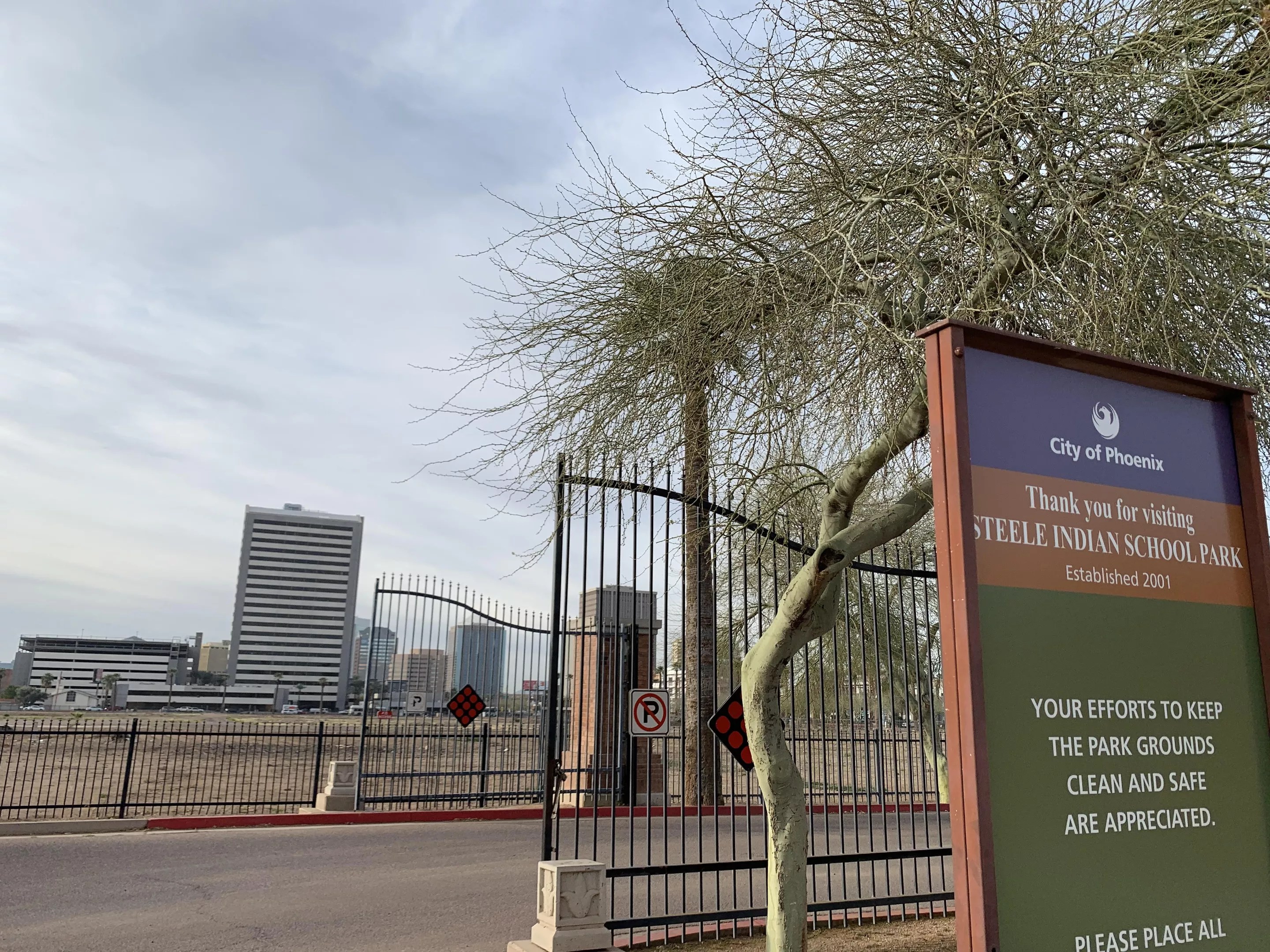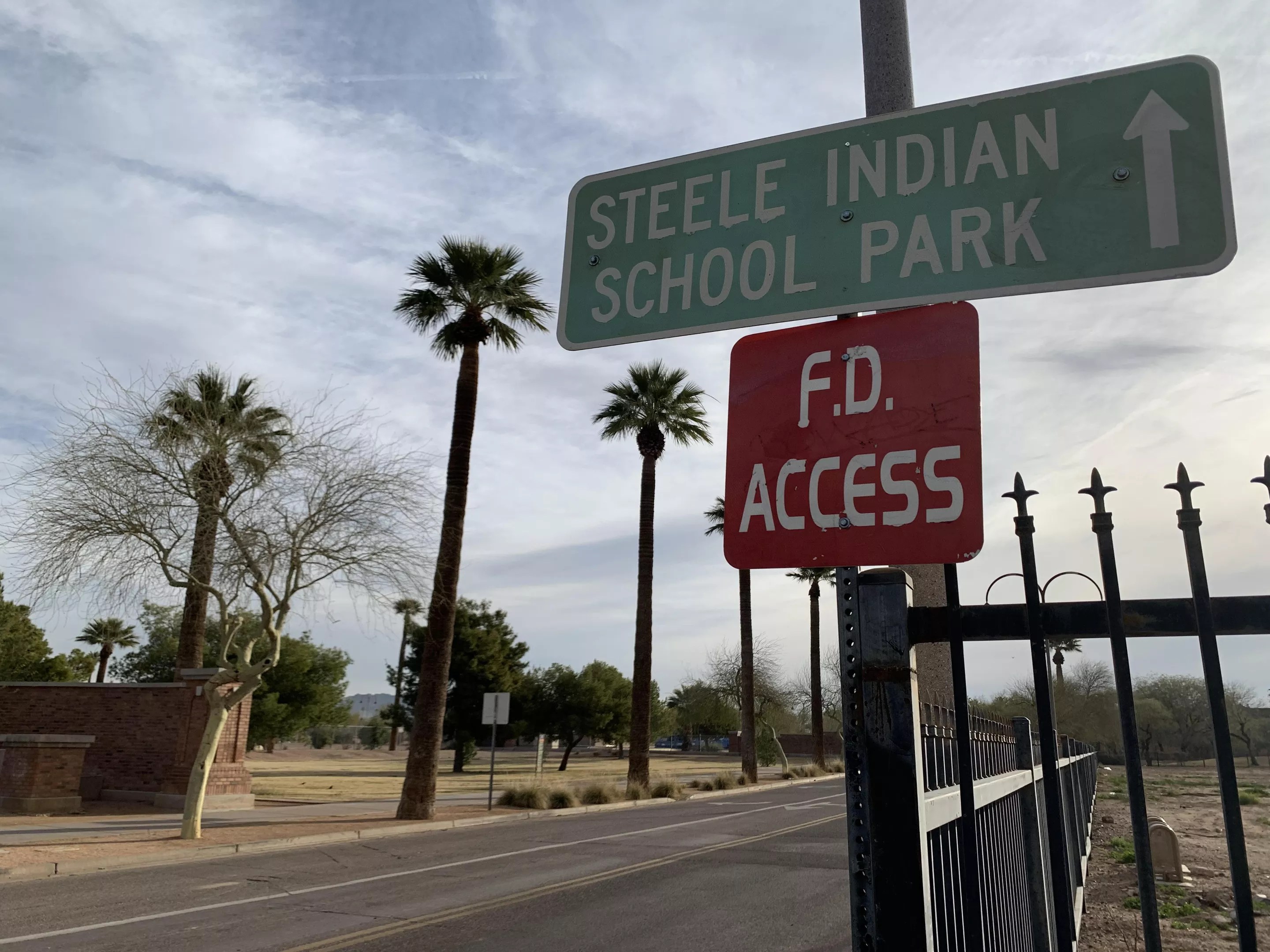 The view inside one entrance of Steele Indian School Park shows housing development nearby.