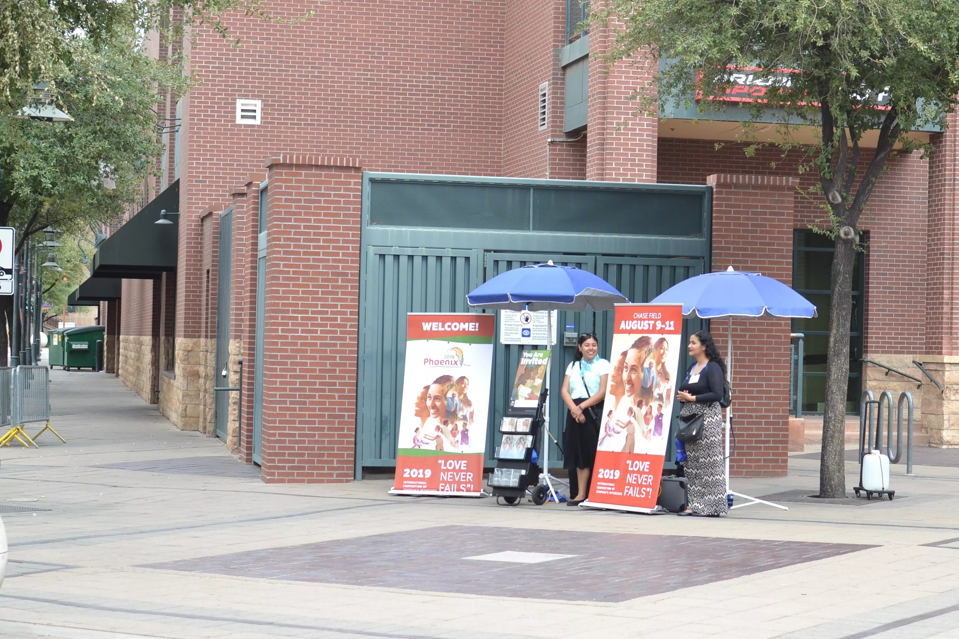 Two Jehovah’s Witnesses outside Chase Field on August 9, 2019.