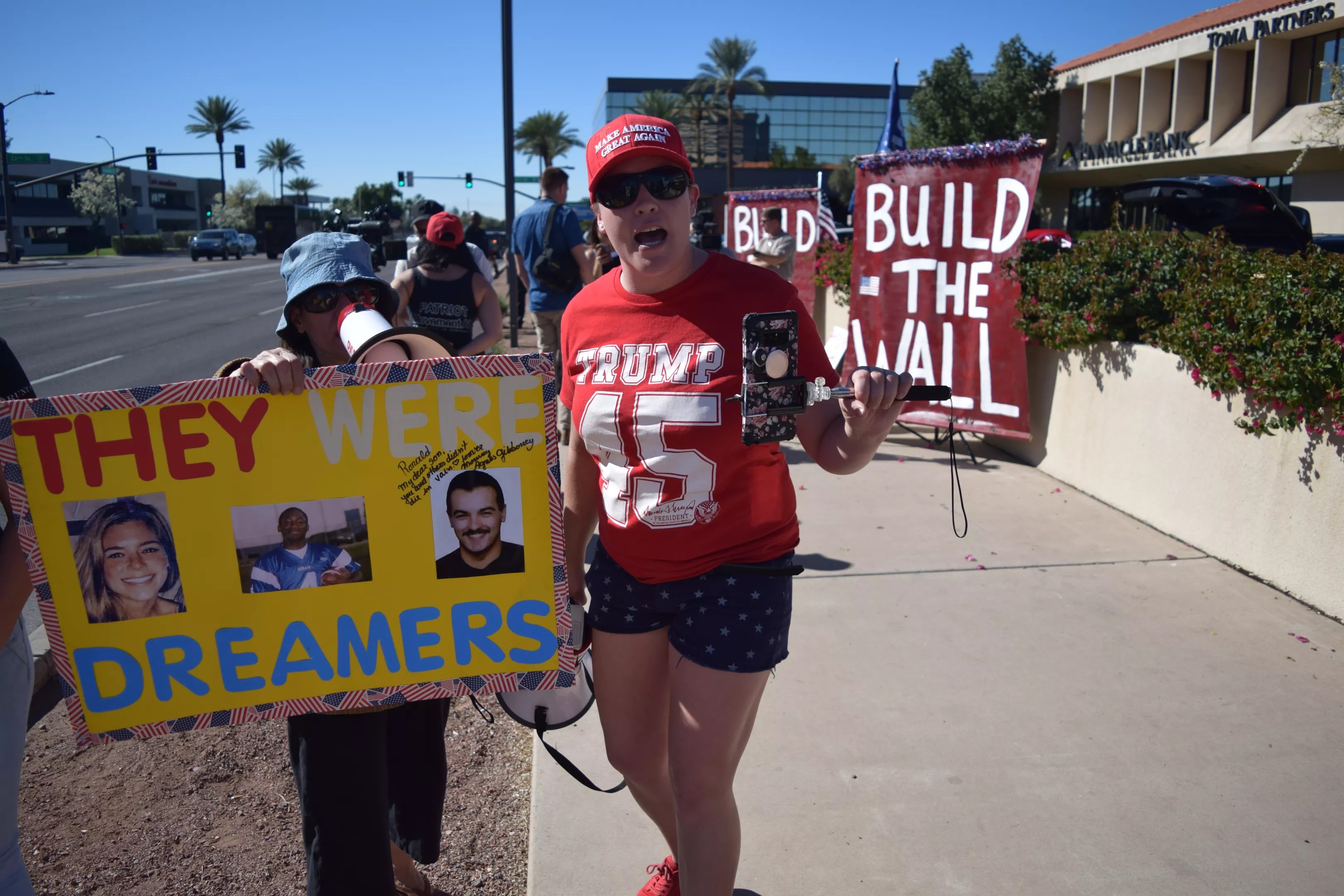 In between were a couple of plainclothes Phoenix police officers stood, arms crossed and stone-faced, making sure the two sides stayed apart and watching to ensure people didn’t step off the sidewalk into Camelback Road.