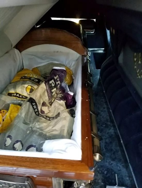 Below: two more pictures of the hearse and cannabis-filled casket.